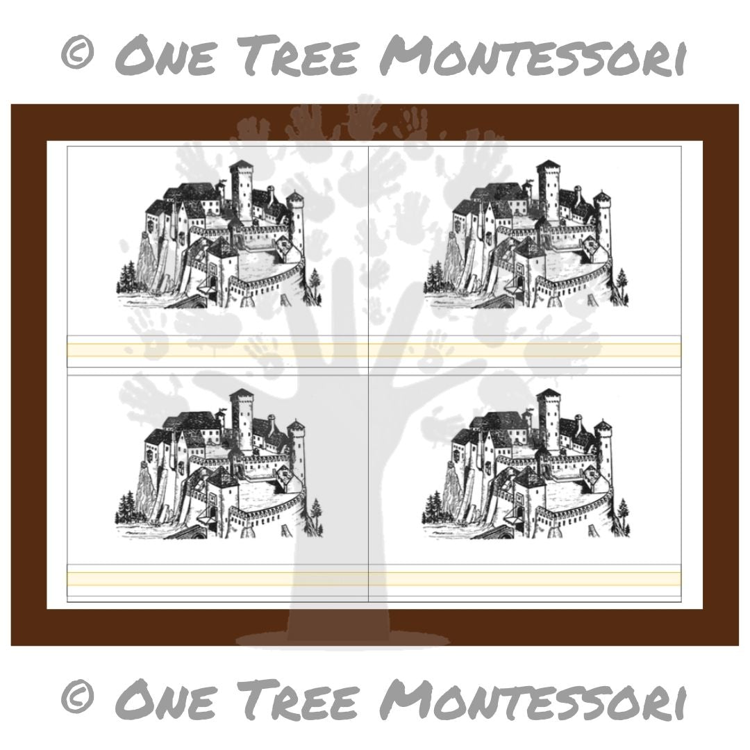 Digitaler PDF-Download von Strichzeichnungen einer europäischen Burg und ihrer Teile. Vier auf einer Seite.