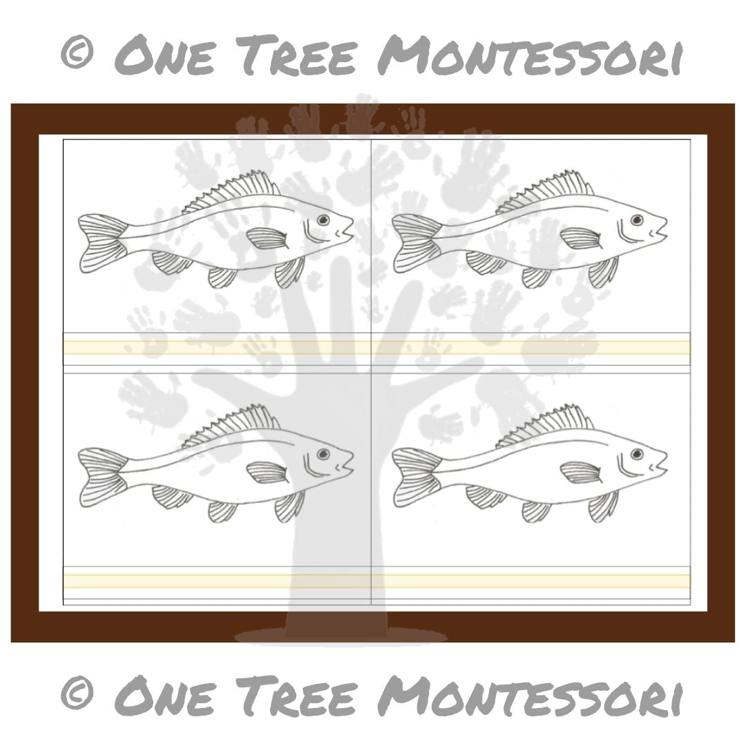 Digitaler PDF-Download von Strichzeichnungen für die Teile eines Fisches. Vier auf einer Seite.