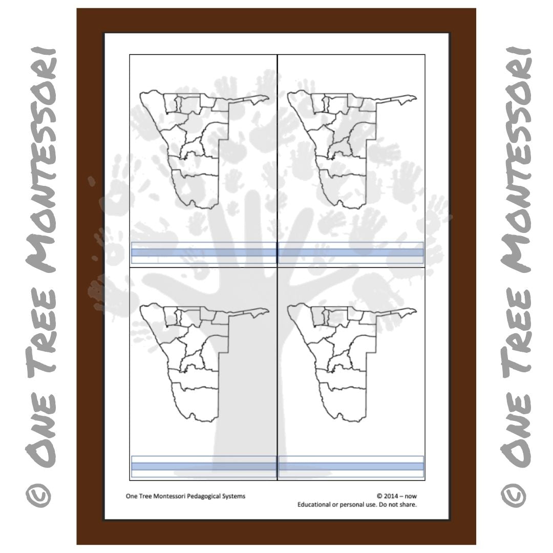 Digitaler PDF-Download von Strichzeichnungen von Namibia und seinen 14 Regionen. Vier auf einer Seite.