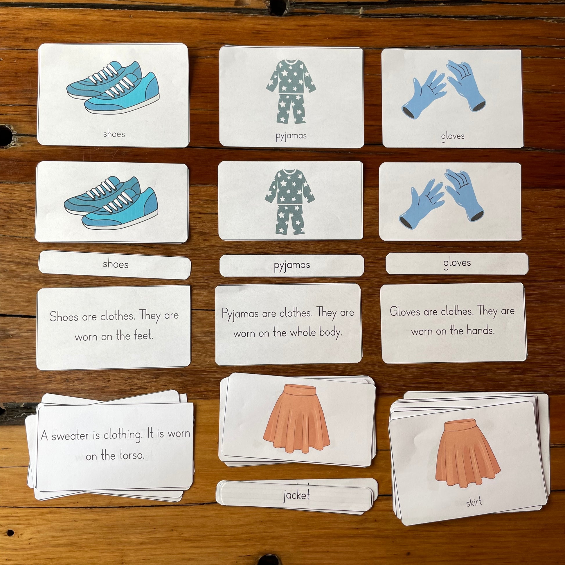 Erforscht Kleidungsstücke mit klaren Bildern und einfachem Text. Mit unseren Karten werden Ordnung, Lesen und visuelle Unterscheidung entwickelt. Sie bauen außerdem den Wortschatz auf und helfen bei der Klassifizierung und Kategorisierung. Und das alles, ohne, dass der Spaß beim Lernen abhanden kommt!Teilen