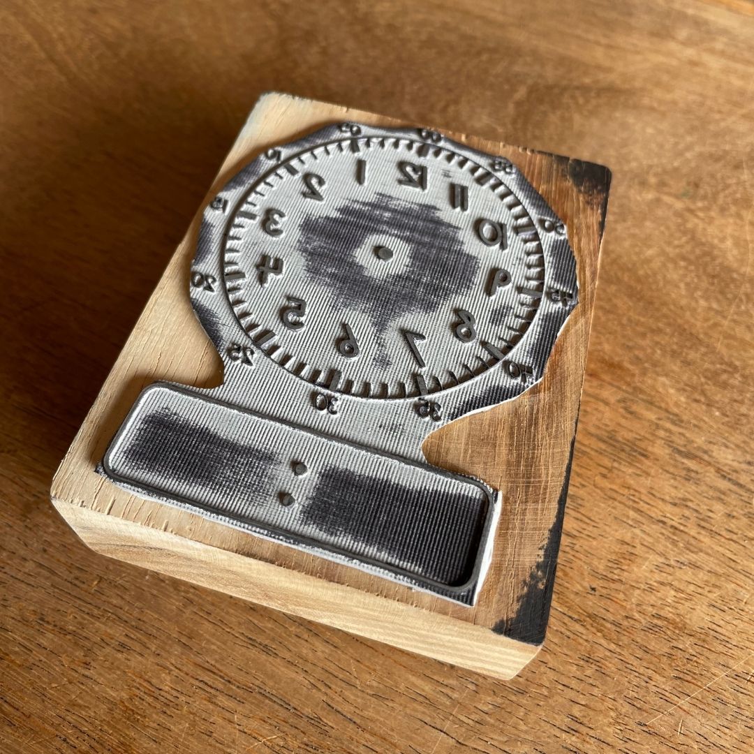 Dieser Stempel verfügt über ein sauberes Ziffernblatt mit den Stunden und Minuten sowie einen Block zum Schreiben der digitalen Zeit.