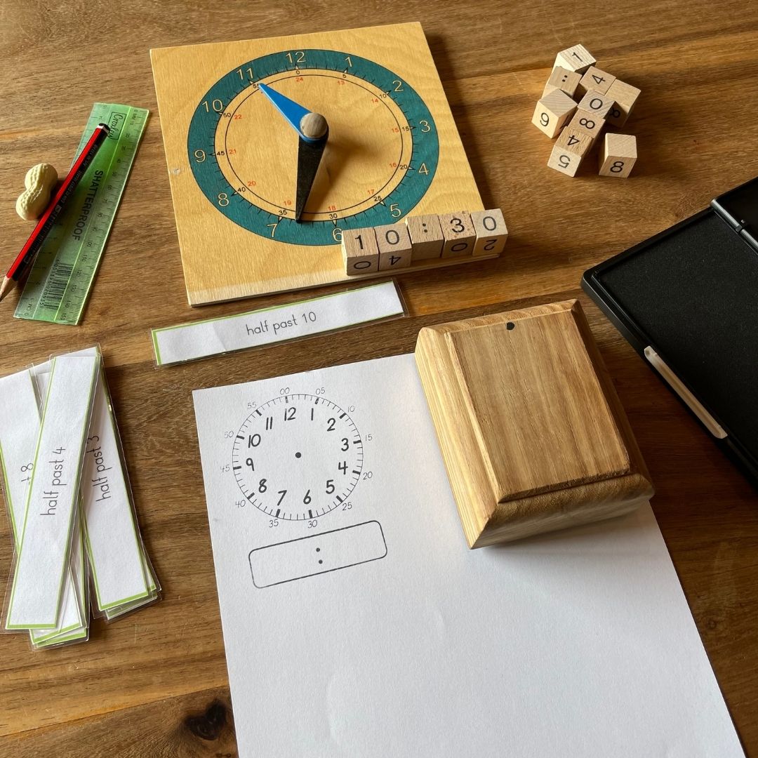 Traditionell gibt es in Montessori-Umgebungen nur eines von jedem Material. Mit diesem Stempel geben Sie Ihrem Kind/Ihren Kindern die Möglichkeit, ihre Arbeit mit der Uhr festzuhalten. Sie können Zeiten des Tages festhalten, wenn etwas Wichtiges passiert, Zeiten aus Übungszetteln erstellen oder mit einem Freund zusammenarbeiten, um ein Zeitquiz zu erstellen.