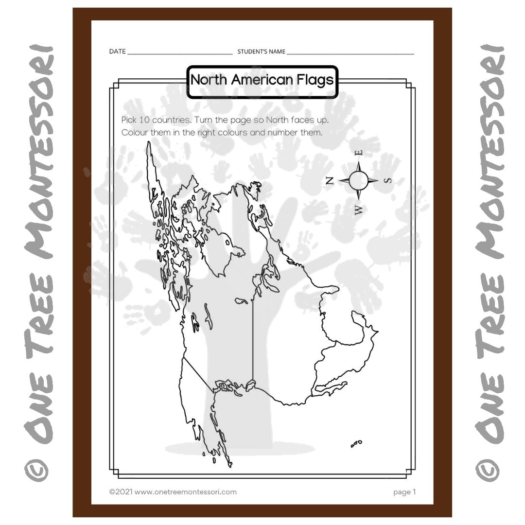 Digitaler PDF-Download zum Aufzeichnen von 10 ausgewählten nordamerikanischen Flaggen und ihren Ländern.