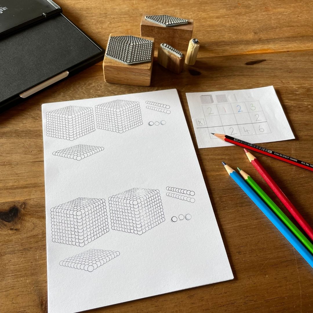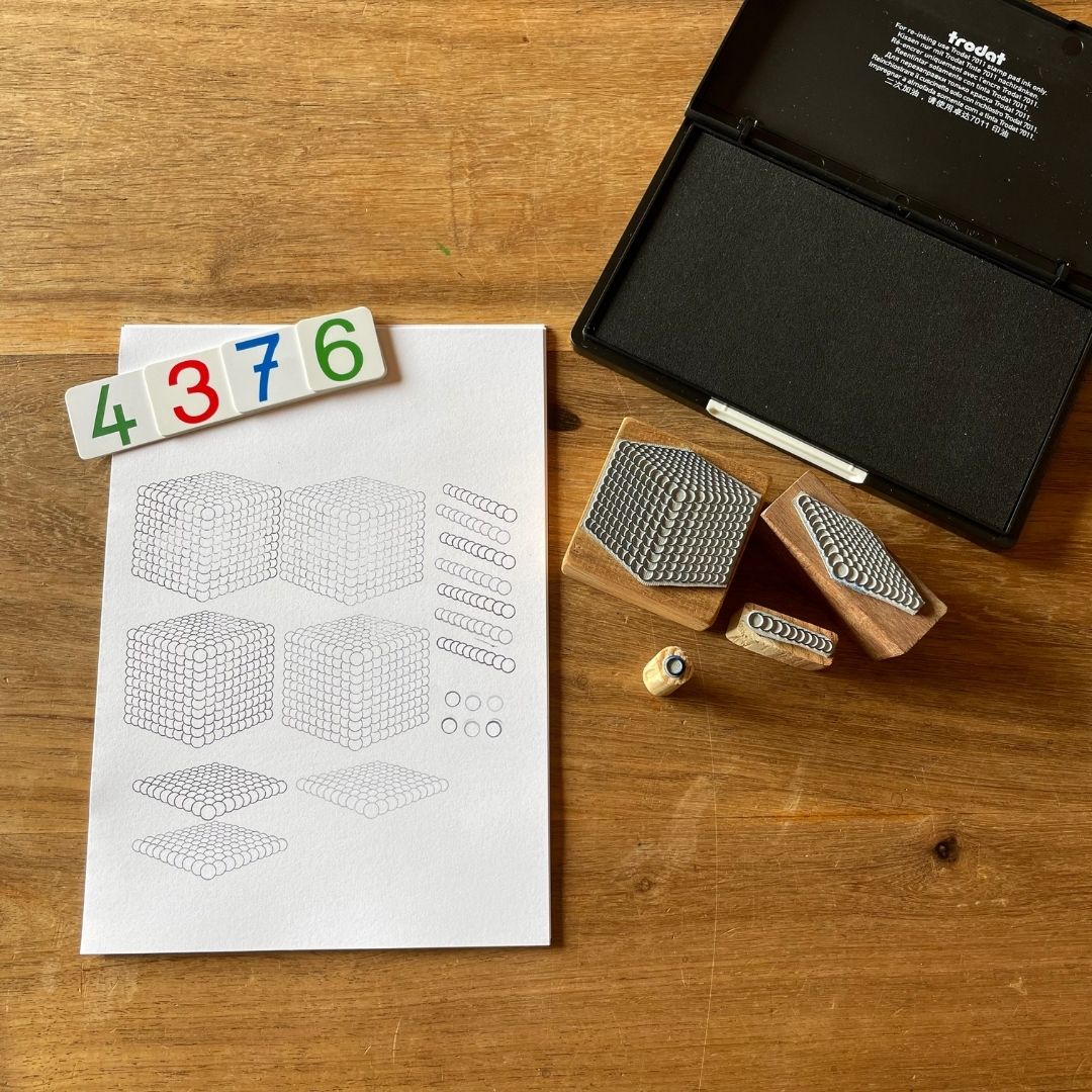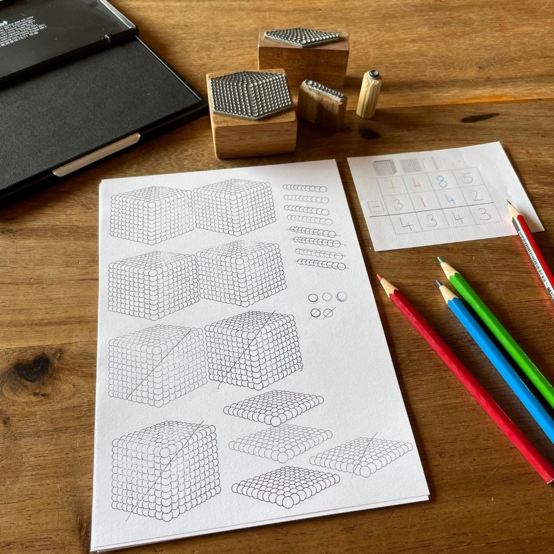 With these stamps, children can record the numbers they make with the Golden Beads. They can independently practise place value and create and solve addition, multiplication and subtraction problems.