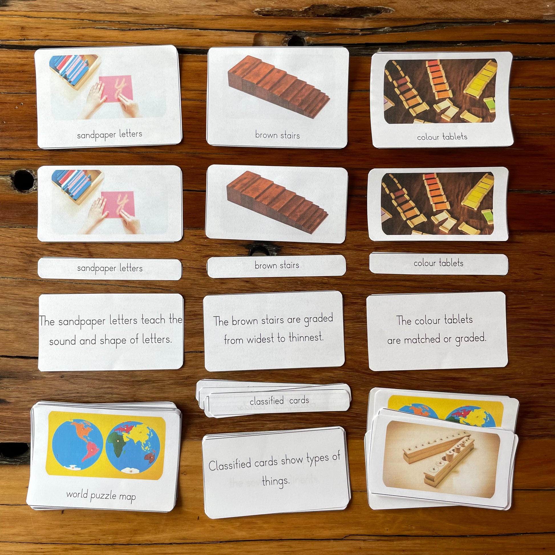 Explore Montessori materials with clear pictures and simple text. Our cards develop order, reading and visual discrimination. They build vocabulary and help with classification and categorisation. Not only that, they make learning fun and easy!Share