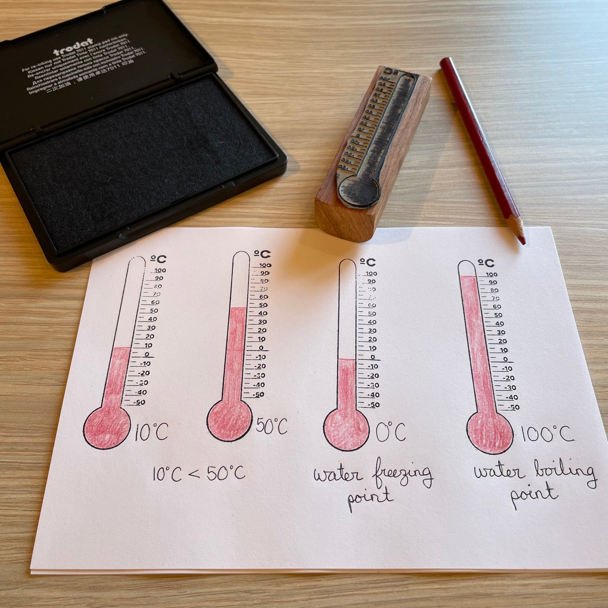African-made rubber stamps of a Montessori Celsius-Thermometer. It's the perfect math extension for your classroom or home!